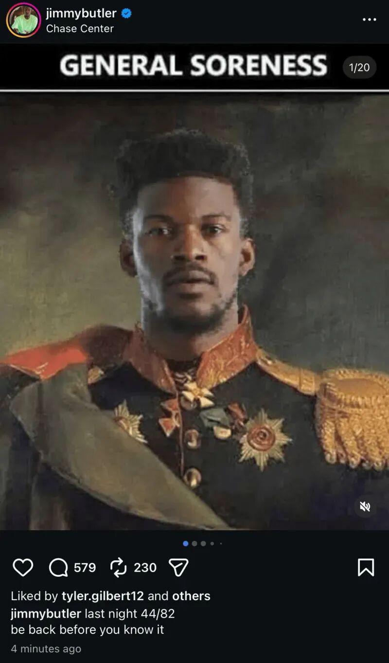 该梗源自于森林狼时期,巴特勒向球队请求交易后长时间以全身酸痛(General Soreness)理由缺席,森林狼球迷则P图称呼其为酸痛将军(General Soreness的另一层释义)。